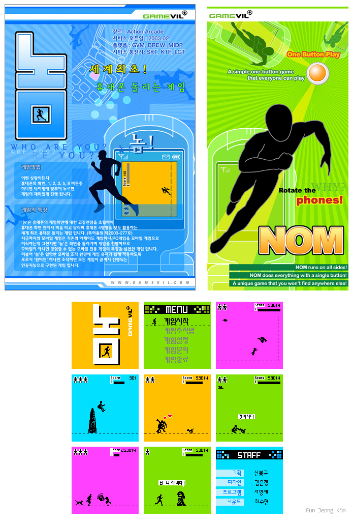 Title: “NOM" Genre: Mobile One-Button Game Company: Gamevil Co., Ltd. | 2003 Position: UI, Character, Map, Objects, Web and POP Design Tools: Photoshop, Illustrator, G-tool